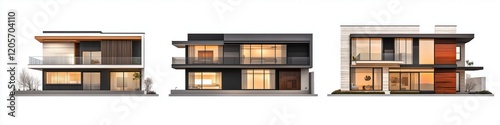 Three modern Contemporary house style facades showcasing different architectural styles, featuring large windows, balconies, and a mix of materials like wood and metal.