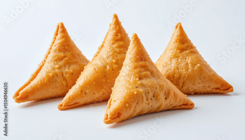 Three perfectly golden-brown samosas arranged on a white background. Their crispy texture and savory aroma are almost palpable.