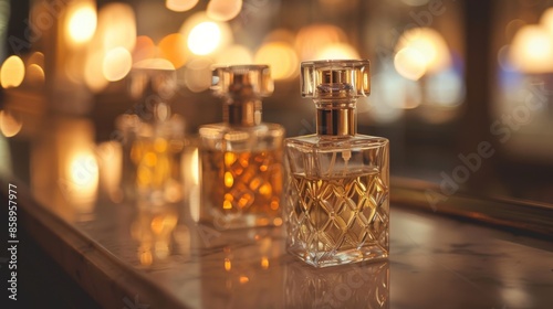 Three perfume bottles are displayed on a counter