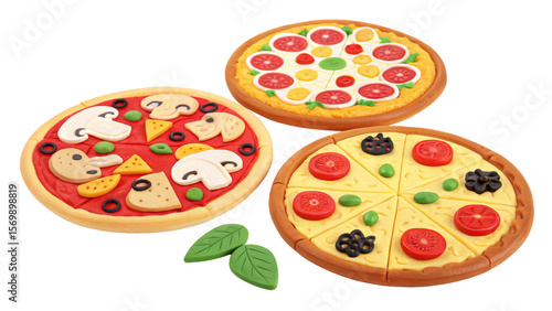 Three Play Clay Pizzas Isolated on Transparent Background, Food, Toy, Pizza, Clay, Play Food