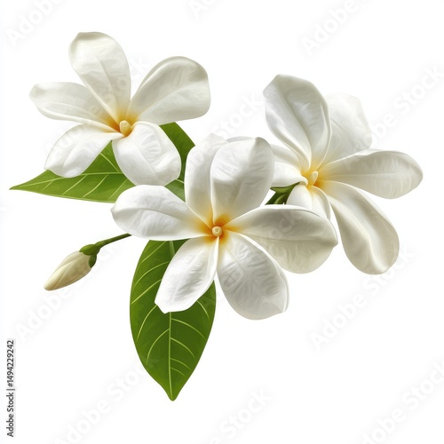 Three pristine white blossoms with vibrant green leaves and an unopened bud