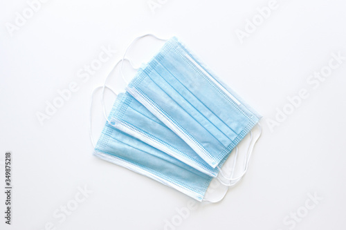 three protective medical masks blue on a white background