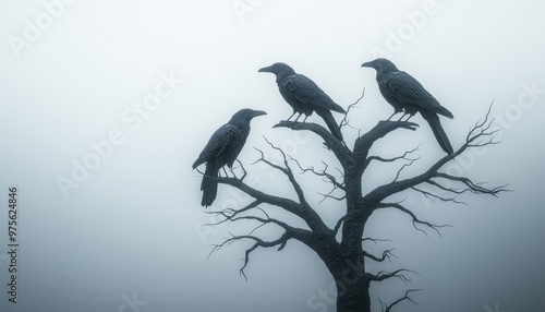 Three ravens perched on a bare tree branch in a foggy atmosphere, creating a mysterious and eerie scene.
