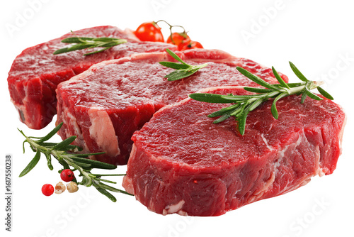 Three raw beef steaks, seasoned with rosemary, garnished with red peppercorns and cherry tomatoes
