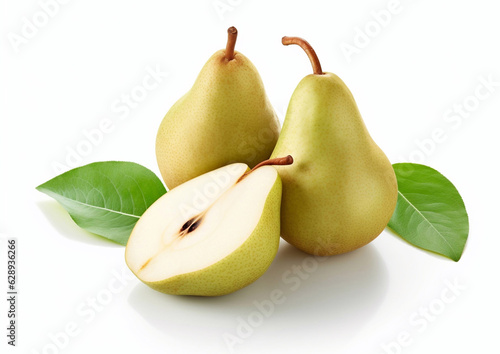 Three ripe fresh pears with leaves on white background.Macro.AI Generative