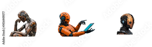 Three robots in different poses and states, cut out transparent