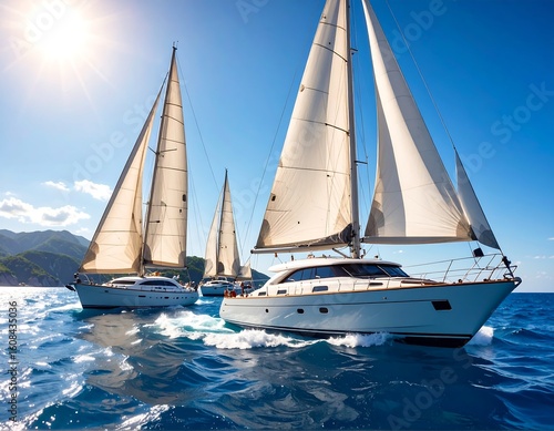 Three sailboats in a sunlit ocean. White sails billow, catching the breeze. Boats are light colored. Clear, sunny sky. Water is a deep blue