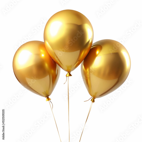Three shiny gold balloons isolated on white background representing celebration and joy