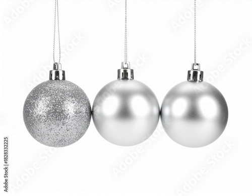 Three Silver Christmas Ornaments Hanging in a Row on a White Background