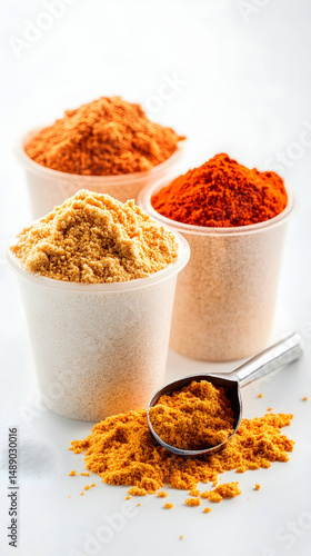 Three small cups of various orange-toned powders, a spoonful spilling onto a white surface
