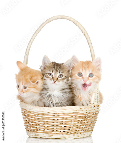 three small kittens in a basket. isolated on white background