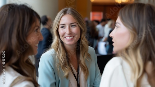 Three smiling female business professionals participate in a lively networking event, sharing ideas and building connections in a well-lit conference atmosphere