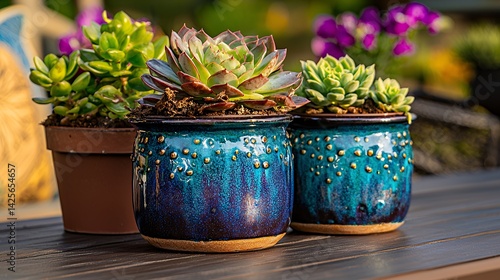 Three Succulents in Blue and Brown Ceramic Pots on Wooden Table