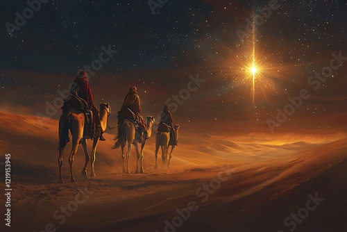 Three travelers on camels trek across golden desert dunes under a radiant star in a breathtaking, starlit night sky.