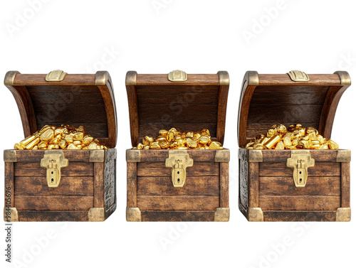 Three treasure chests filled with gold, frankincense, and myrrh, isolated on white background. PNG transparent.