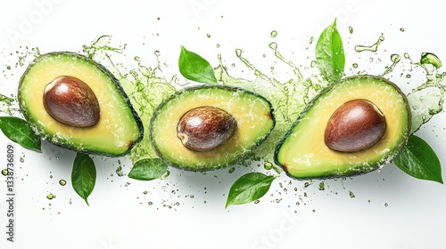 Three vibrant avocado halves with seeds and fresh green leaves surrounded by a refreshing splash on a clean white background studio shot