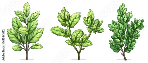 Three vibrant green herb illustrations, showcasing varying leaf shapes and growth patterns, perfect for culinary or botanical contexts