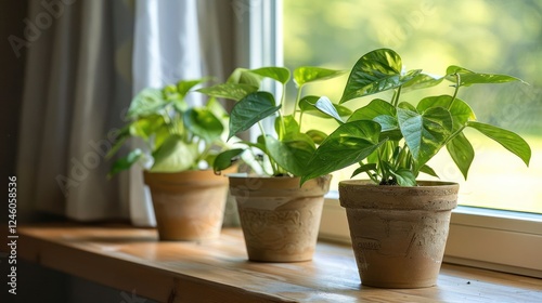 Three vibrant green potted plants on a sunny windowsill with soft natural light