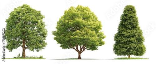 Three vibrant green trees against a white background. Full, lush foliage displays healthy growth. Different shapes and sizes highlight variety.