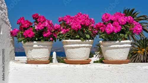 Three Vibrant Pink Rose Bushes in White Pots on a Sunny Mediterranean Wall