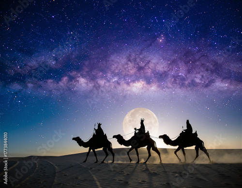 Three Wise Men Riding Camels Under the Milky Way and Moon