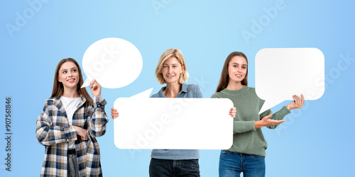 Three women holding empty speech bubbles on blue background.