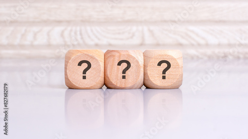 three wooden blocks with question marks over a gray background with copy space
