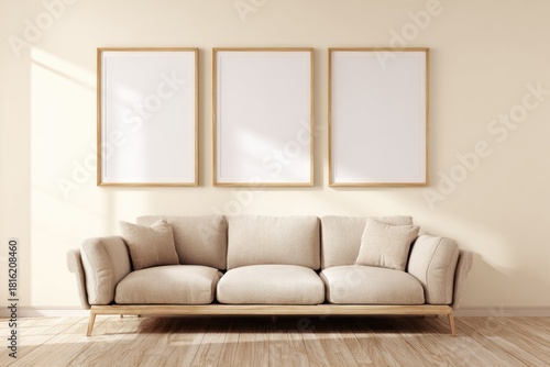 Three Wooden frame poster mockup hanging on living room wall. Stylish and minimal display for modern home interior and wall art presentations.