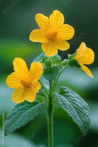 Three yellow flowers with green leaves and stem on a blurred background nature closeup