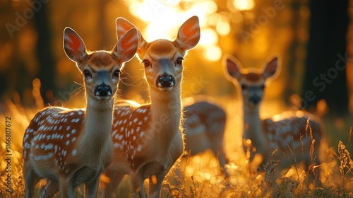 Three young deer fawns stand in a forest at sunset, backlit by golden light.
