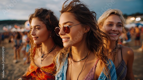 Three young women are happily walking on a sunny beach during a music festival. The stylish friends are enjoying the live music, dancing, and laughing together by the sea.
