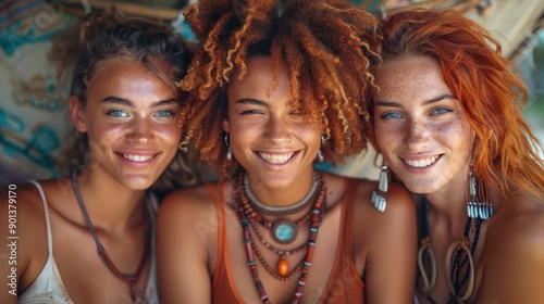 Three young women with different hair styles and vibrant smiles, adorned with jewelry and light clothing, pose closely together, radiating joy and friendship.