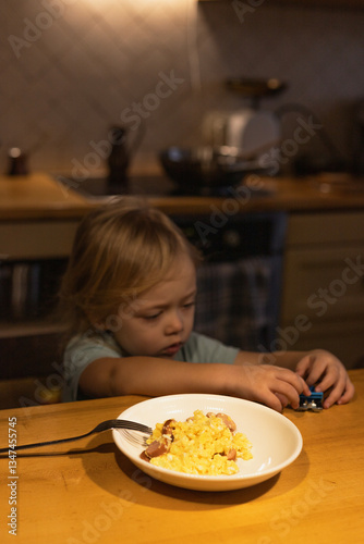 Three-year-old boy playing with a toy car during breakfast, boy sitting in front of a plate of food