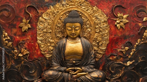 Tibetan Buddha art with intricate details and traditional motifs, rich colors depicting spiritual elements