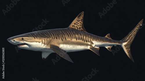 Tiger shark swimming in dark water.