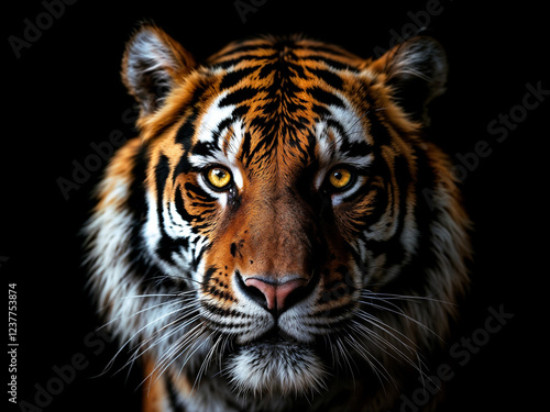 Tiger stares intensely with golden eyes against a stark black backdrop showing its beautiful orange and black stripes