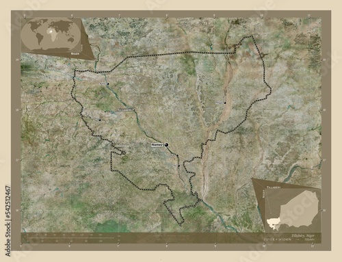 Tillabery, Niger. High-res satellite. Labelled points of cities