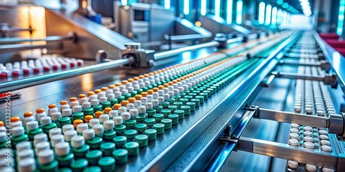 Tilt-Shift Photography: Conveyor Belt of Blister Packs in Modern Pharmaceutical Plant