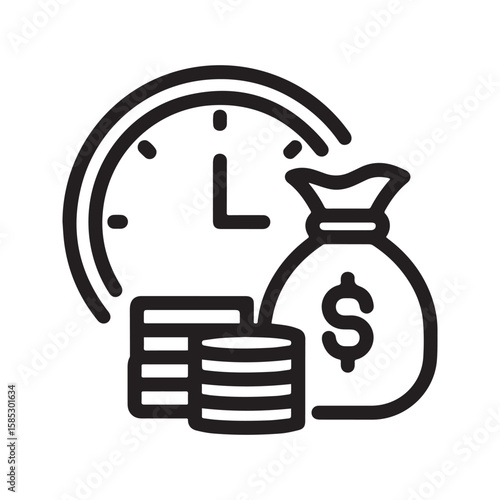 Time is money concept icon with clock, coins, and money bag representing financial deadlines and investment.