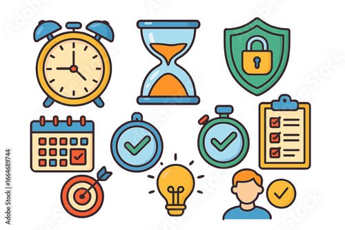 Time management and productivity icon set. Vector icons for business efficiency, planning, security, and strategy. Includes clock, calendar, target, shield, and idea lightbulb.