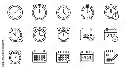 Time Management Vector SVG Icon Set Simple Line Art Style Clocks Calendar and Notepad Designs for Business Applications