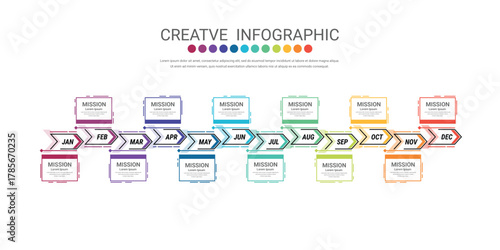 Timeline for 1 year, 12 months, infographics all month planner design and Presentation business.