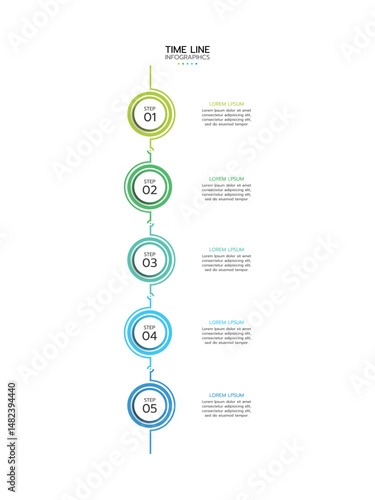 Timeline infographic featuring five vertical, connected circles with a gradient outline from light green to blue. Each circle is labeled "STEP" with a number and has placeholder text.