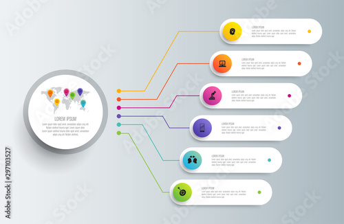 Timeline infographics design vector and business icons with 6 steps. Use in corporate report, marketing, annual report. Network management data screen with charts, diagrams.
