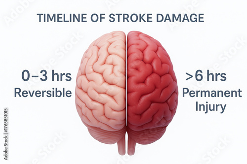 Timeline of stroke damage showing healthy brain hemisphere and damaged hemisphere with time window for reversible and permanent injury