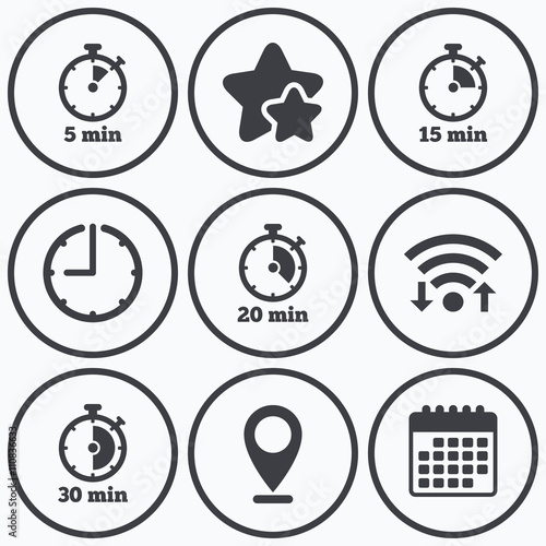 Timer icons. Five minutes stopwatch symbol.