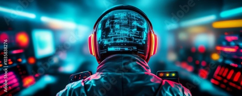 Time-travel suit, digital controls, dark cyberpunk lab, neon accents