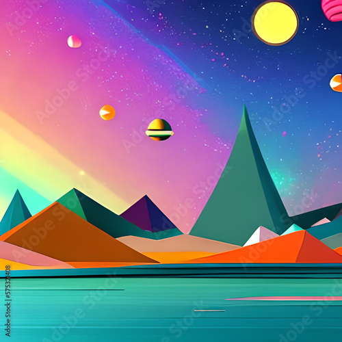 Tiny cute cartoon geometric Extraterrestrial landscape, scenery of alien planet in deep space. AI generated illustration