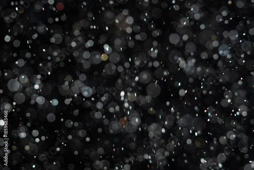 Tiny dust randomly flying in the smoky air, empty space template for objects advertisement. Many dust particles of white powder in low light on empty dark black contrast background, close shot.