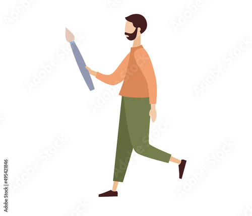 Tiny man artist. Painter with art brush. Vector flat illustration